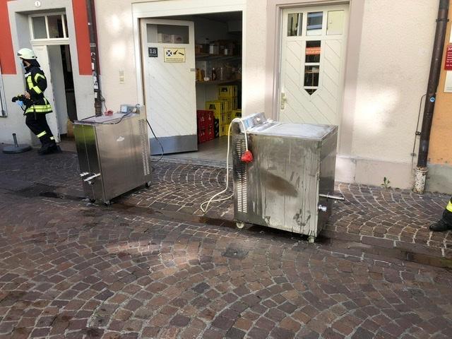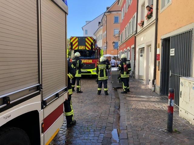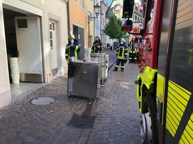 Als die Feuerwehr Konstanz mit ihren alarmierten Einheiten aus der Altstadt und Petershausen an der Einsatzstelle eintrafen, wurde bereits durch mit Arbeiter gemeldet, dass das Feuer gelöscht wurde. Durch einen Trupp unter Atemschutz wurden die Räumlichkeit kontrolliert und das defekte Gerät nach draußen gebracht und eine Belüftung eingeleitet.