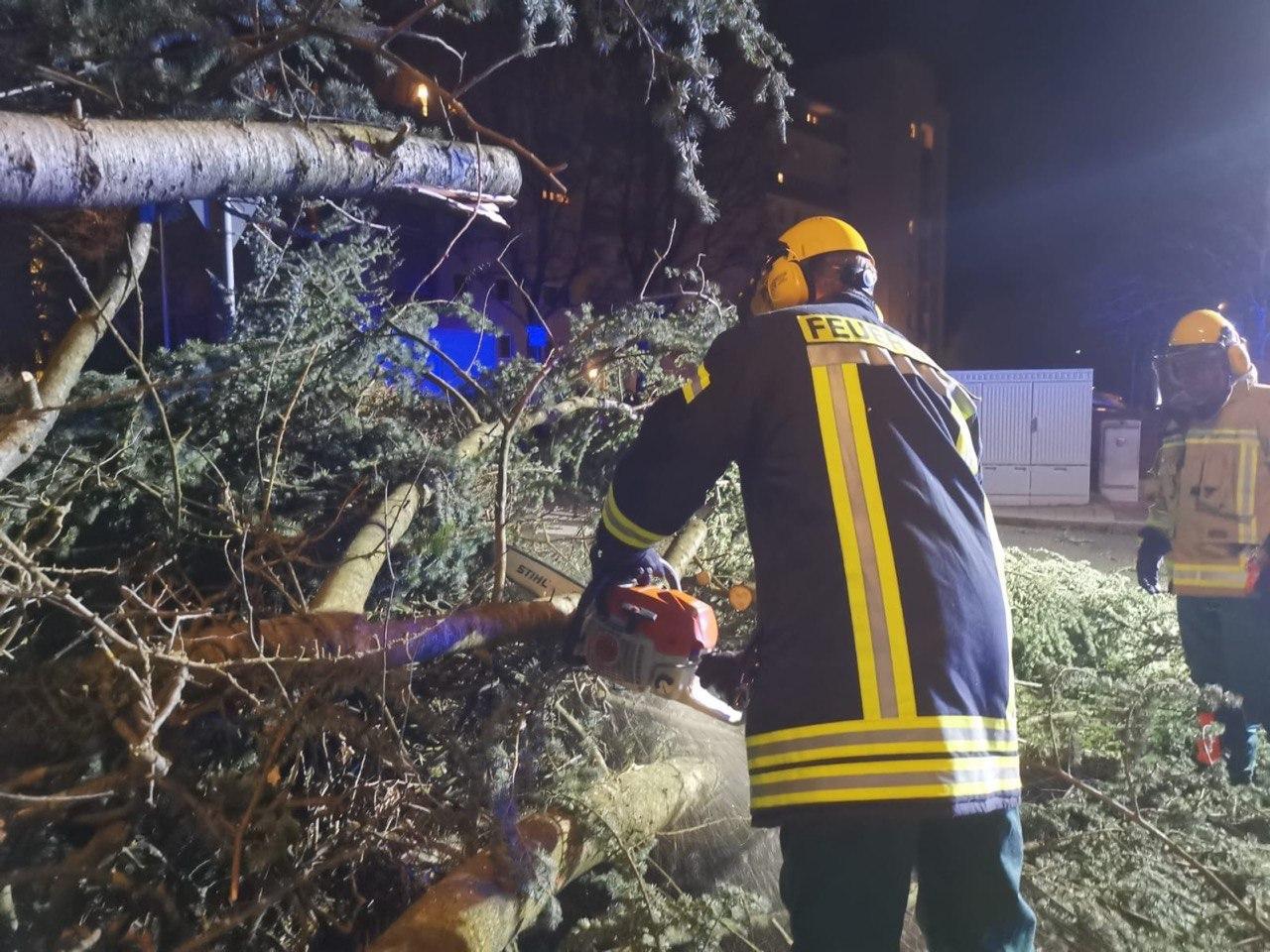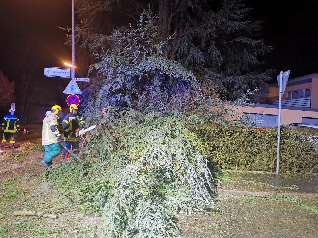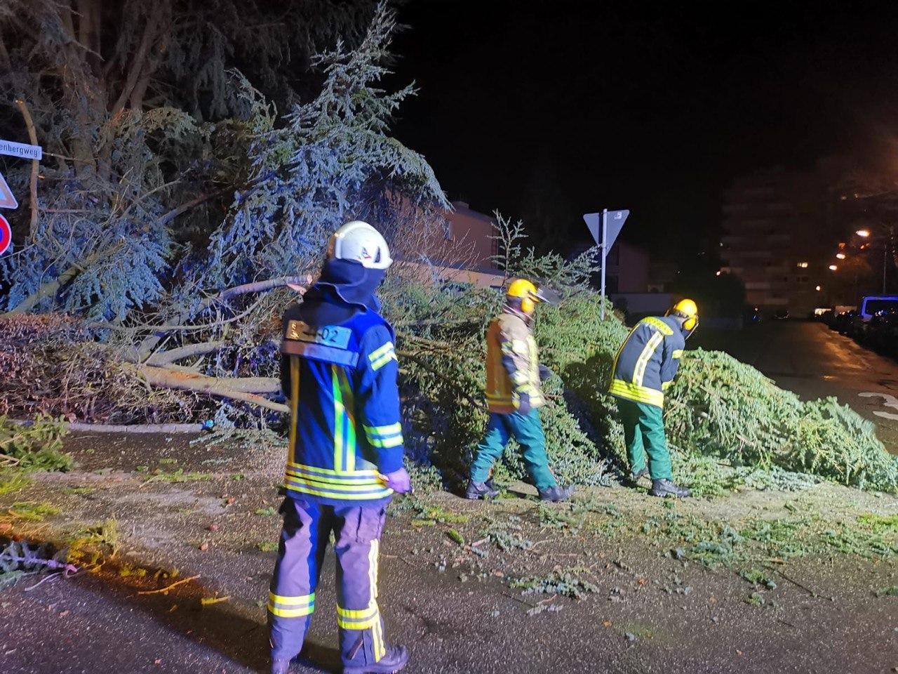 Kurz nach 20 Uhr wurde der Löschbereich Wollmatingen zu einem umgestürzten Baum in den Gutenbergweg gerufen. Der Baum blockierte teilweise die Kreuzung Gutenbergweg/ Buhlenweg und behinderte den Verkehr. Mit Hilfe einer Motorsäge wurde der Baum zerkleinert und anschließend von der Straße geräumt.