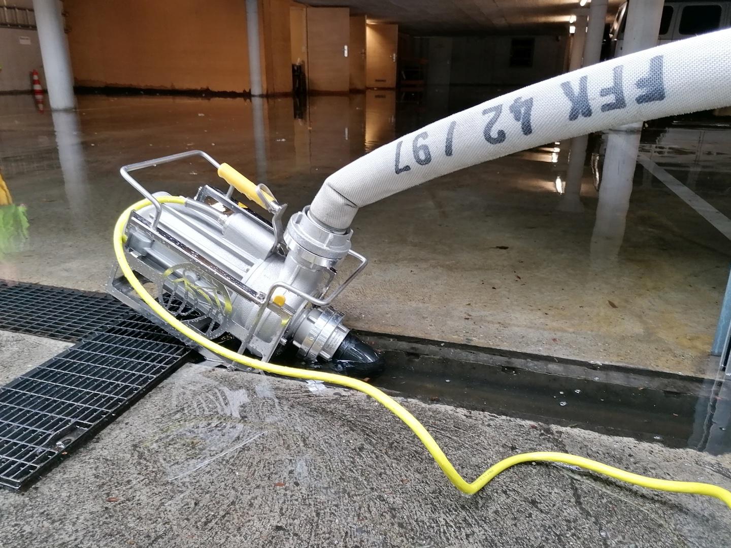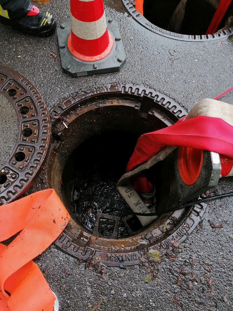 Aus unklaren Gründen konnte das Wasser nicht in die öffentliche Kanalisation abfließen. Mithilfe mehrerer Tauchpumpen und einer Chiemseepumpe wurde begonnen sowohl das Wasser aus der Tiefgarage, als auch aus der verstopften Kanalisation des Betriebsgeländes in die öffentliche Kanalisation auf der Straße abzupumpen. Zeitweise wurden rund 3500 Liter Wasser pro Minute abgepumpt was etwa 23 gefüllten Badewannen entspricht. Nach gut zwei Stunden konnte die Einsatzstelle an einen Verantwortlichen der Firma übergeben werden.