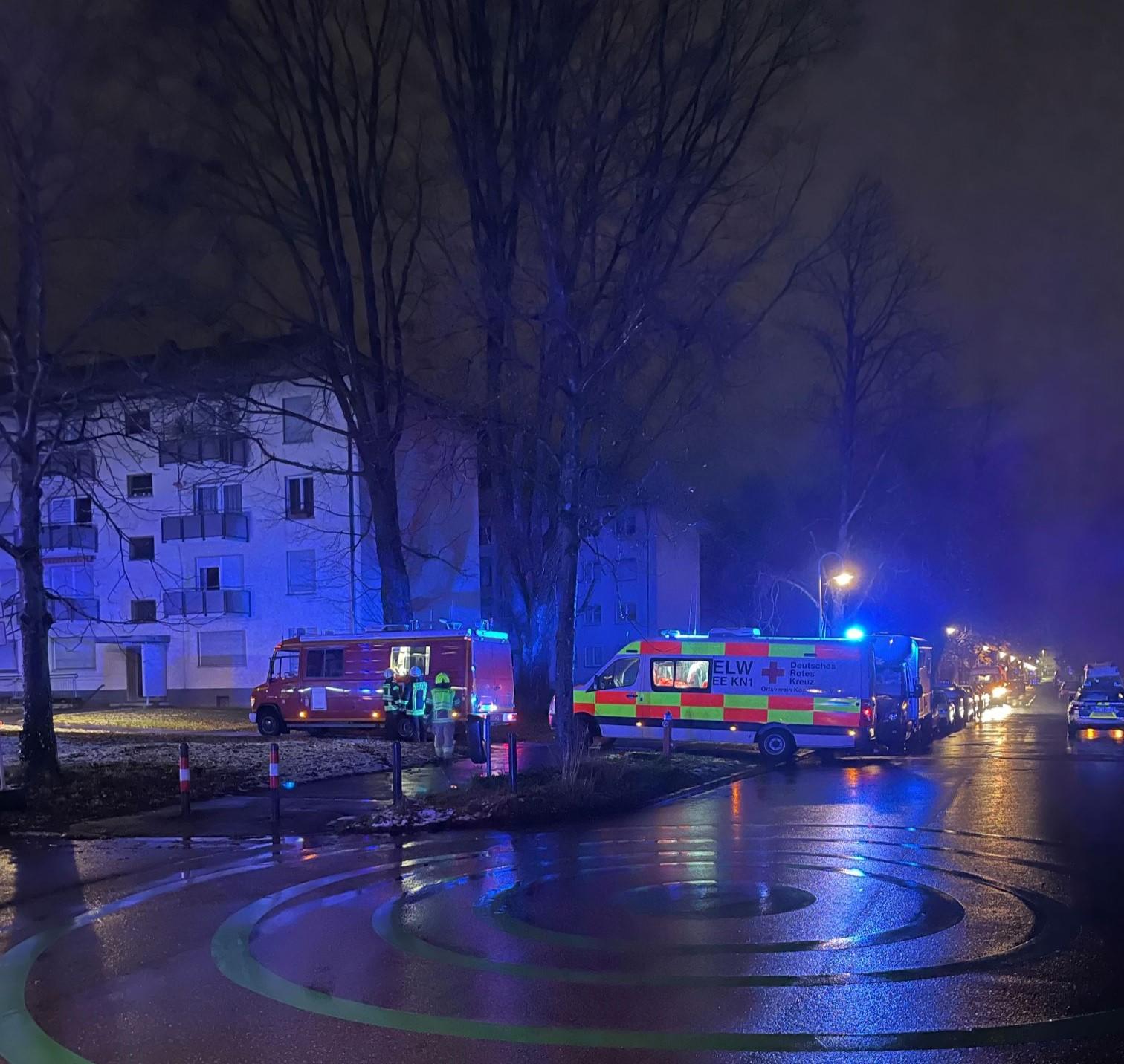 Auf der Anfahrt meldete die Leitstelle einen bestätigten Brand im 2. Obergeschoss, woraufhin seitens des Rettungsdienstes und der Feuerwehr die Einsatzkräfte nochmals verstärkt wurden.