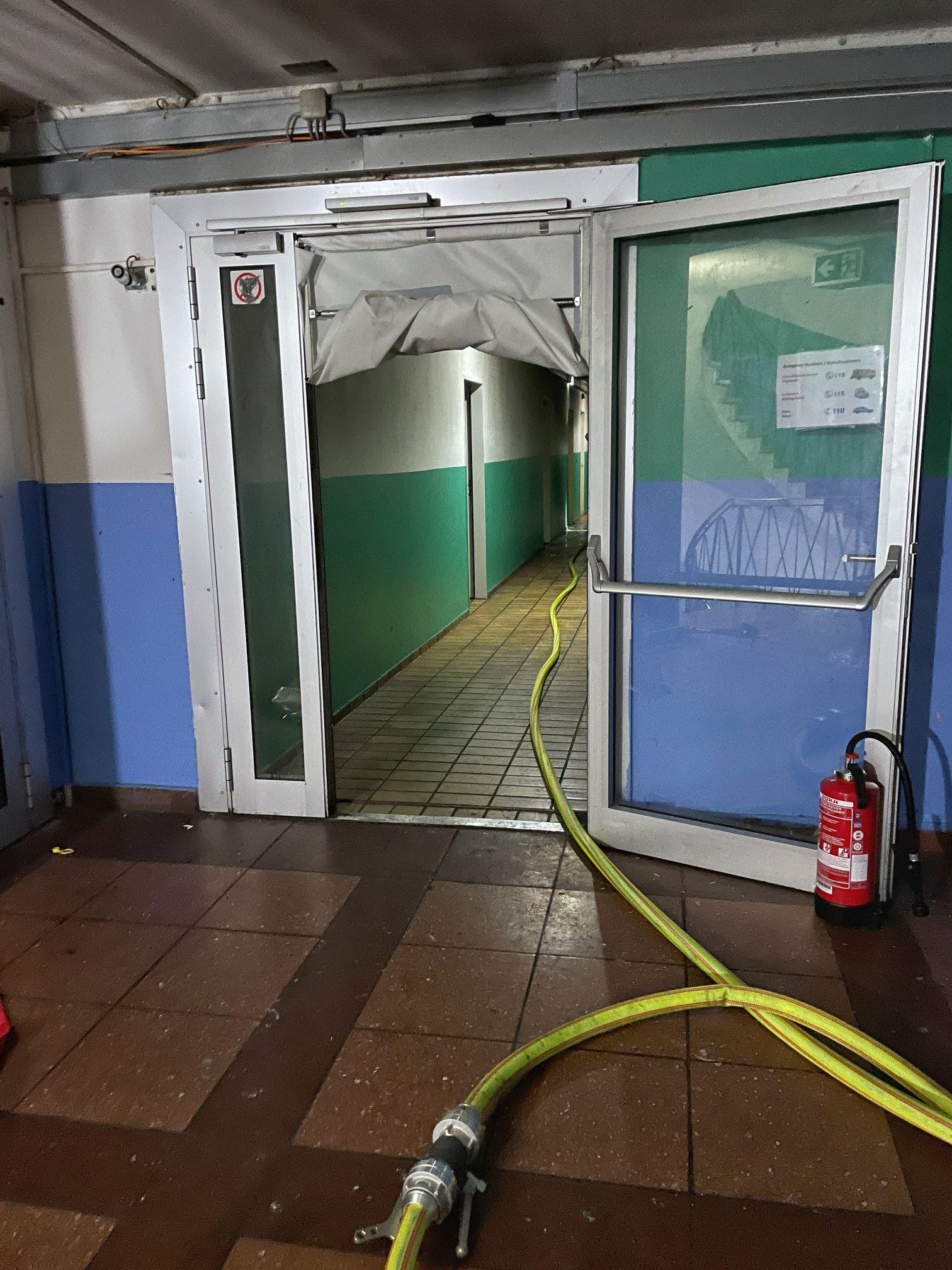 Parallel wurde die Drehleiter in Stellung gebracht und von außen die angrenzenden Zimmer kontrolliert. Zeitgleich kontrollierten weitere Trupps das betroffene und die darüberliegenden Stockwerke auf Personen.