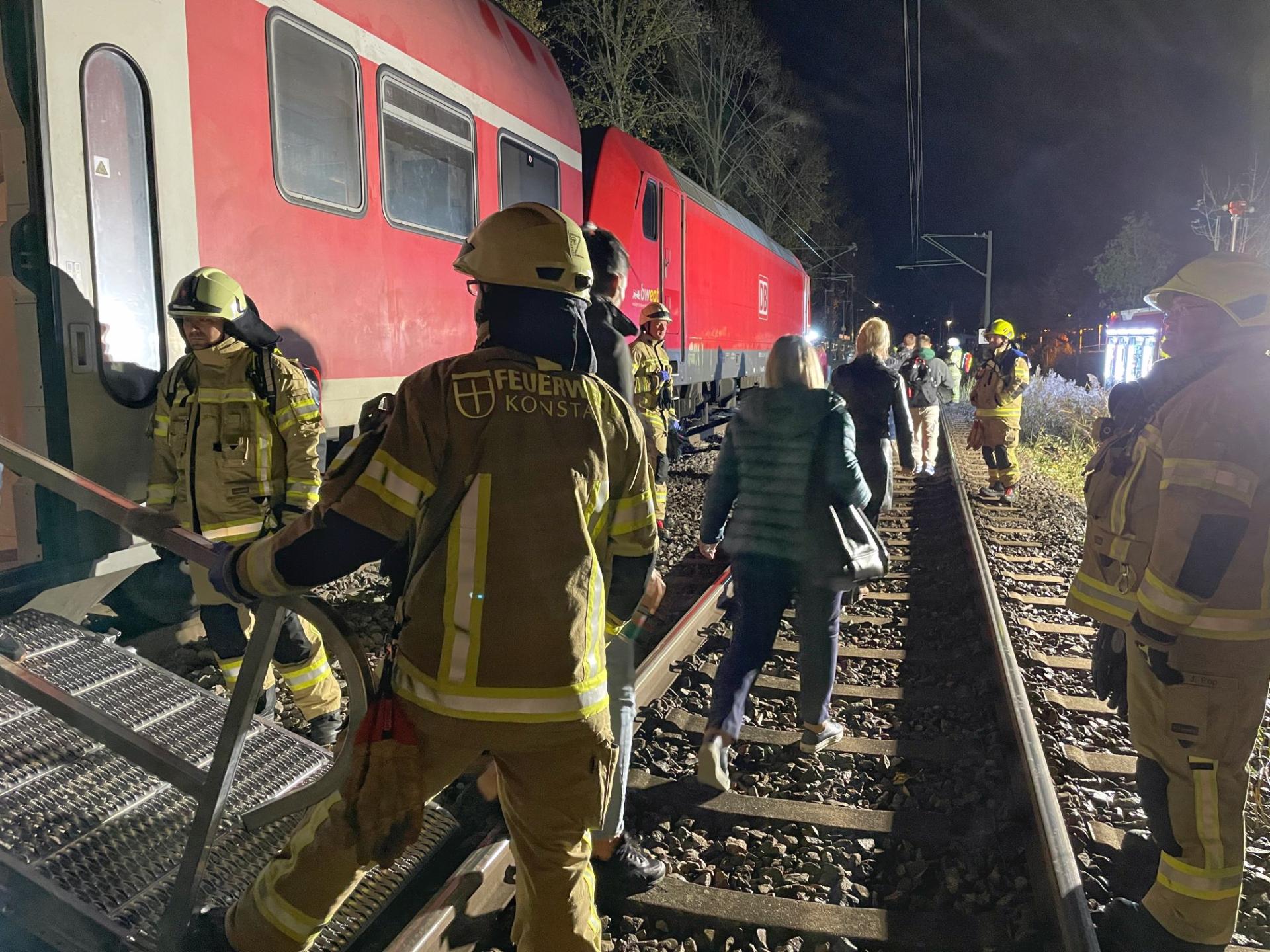 Die Feuerwehr sperrte die Einsatzstelle ab. Mit Scheinwerfern leuchteten die Einsatzkräfte die Unfallstelle und den Bahnhof großflächig aus und bereiteten die Evakuierung des Zuges vor. Dazu wurde von den Stadtwerken Konstanz ein Gelenkbus organisiert. Dieser verbrachte die evakuierten Fahrgäste an den Hauptbahnhof.
