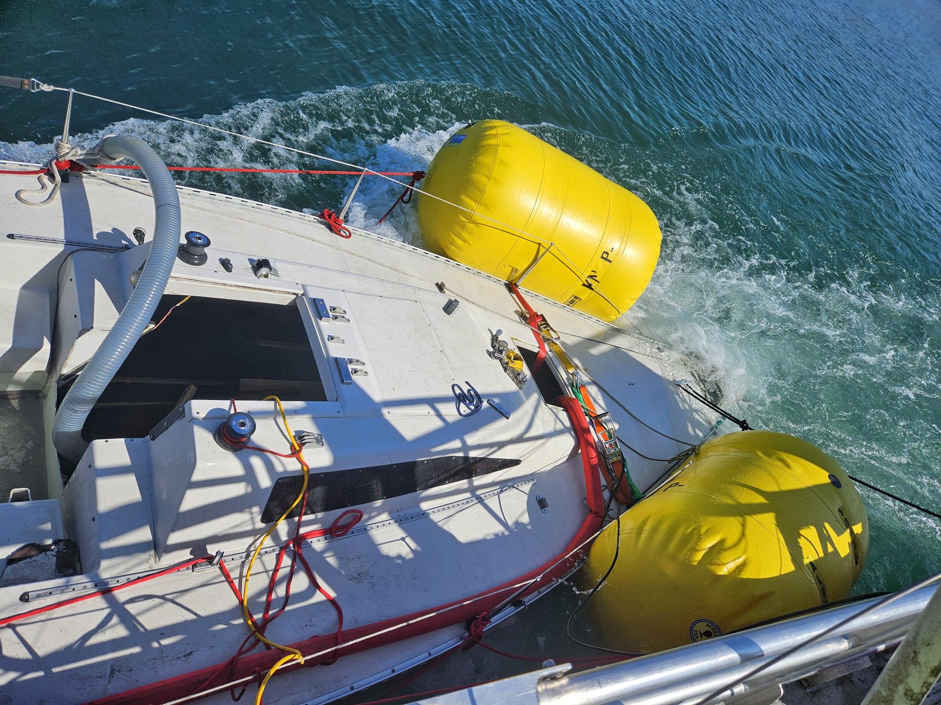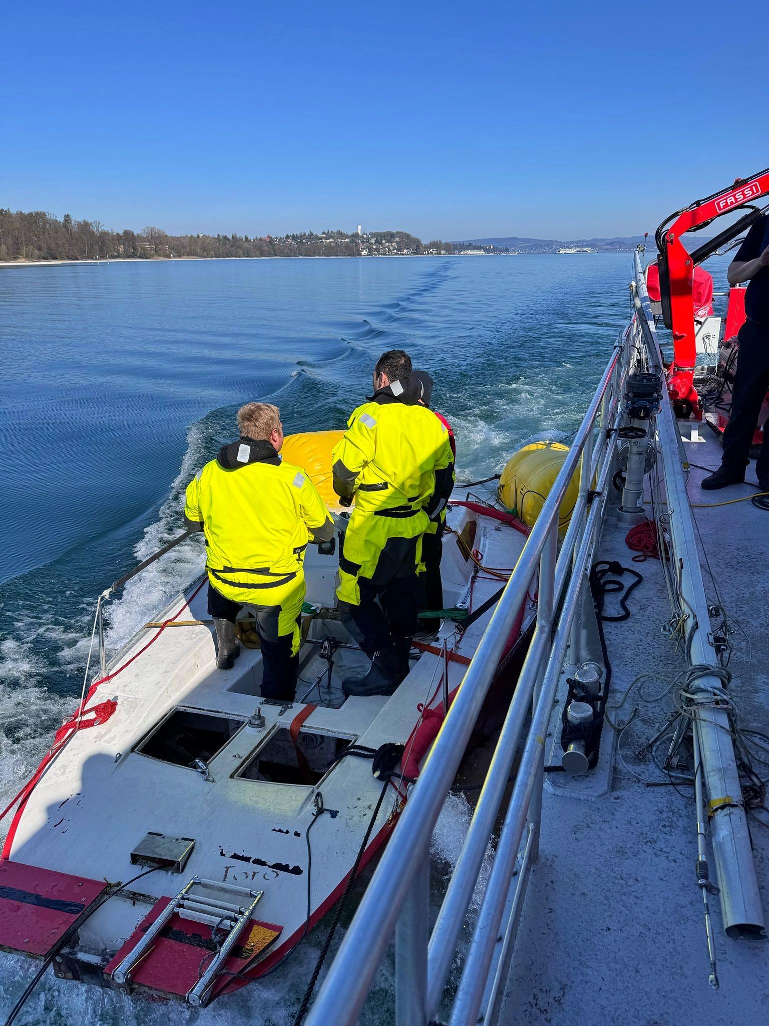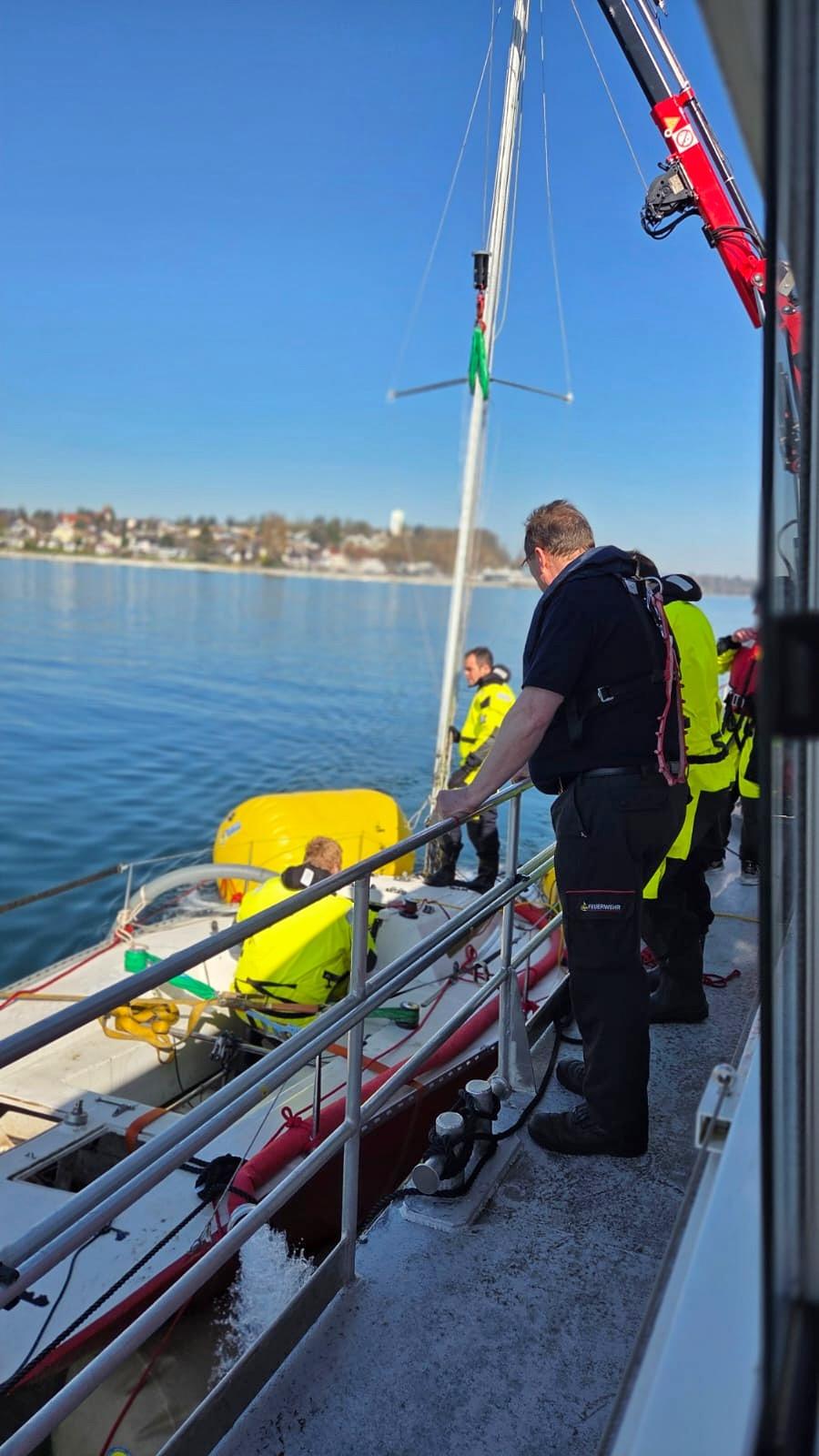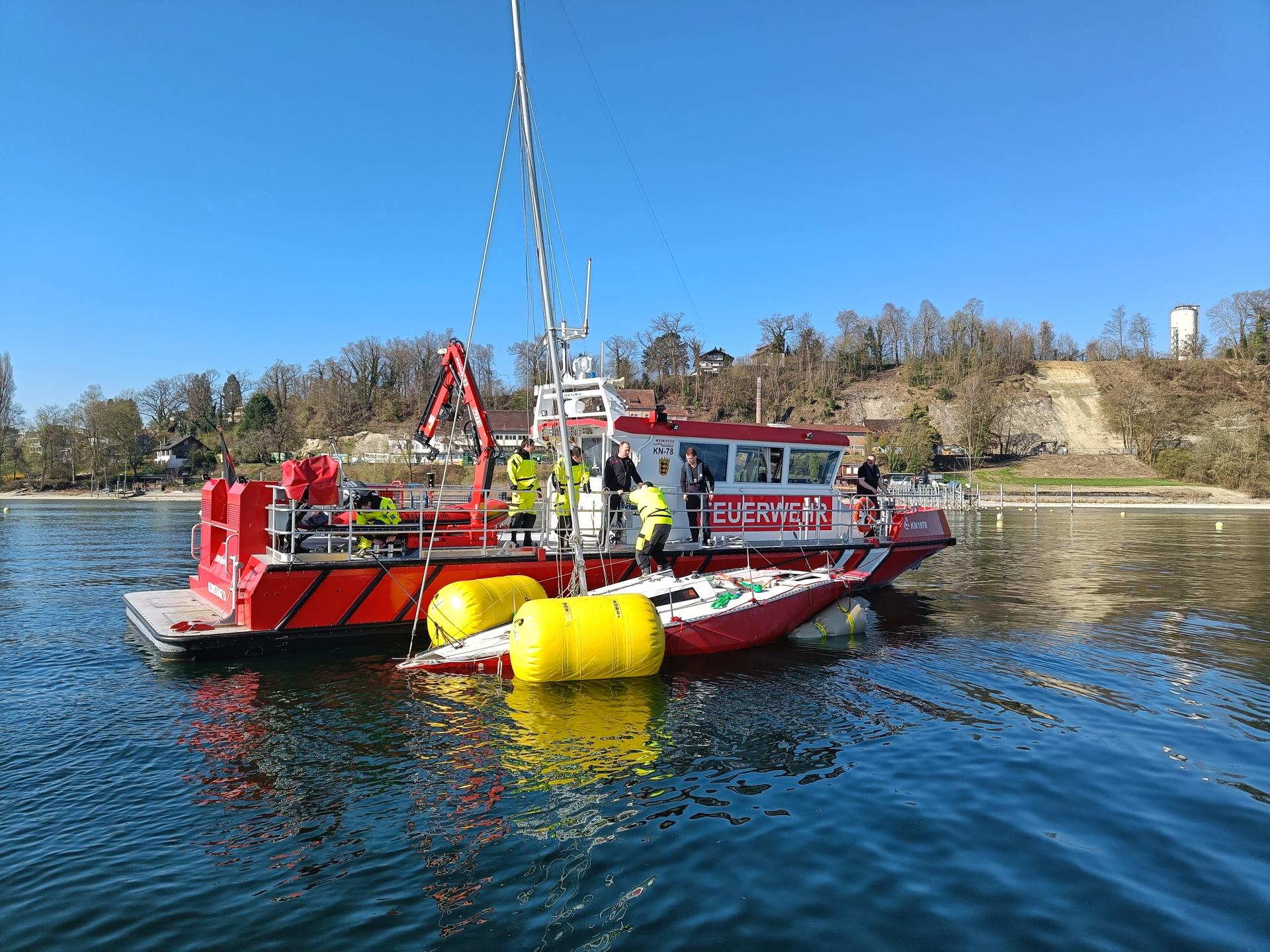 Die Sondereinheit Ölwehr der Feuerwehr Konstanz begann am Samstagmorgen mit der Bergung des Segelbootes. Hierzu wurden das Feuerlöschboot und ein Mehrzweckboot für den Transport des Bergungsmaterials eingesetzt. Unter dem Segelboot wurden vier Hebepontons mit einer Hubkraft von bis zu drei Tonnen angebracht. Das Segelboot konnte so aus dem Flachwasserbereich verbracht werden. Erst im tieferen Wasser war das ganze Ausmaß der Schäden am Rumpf sichtbar. Der Kiel war vollständig abgerissen, und durch die Wellen war ein Loch von fast zwei Quadratmetern in den Rumpf gerissen worden. Dies hatte zur Folge, dass der Havarist ohne Hebesäcke nicht mehr selbstständig schwimmen konnte.