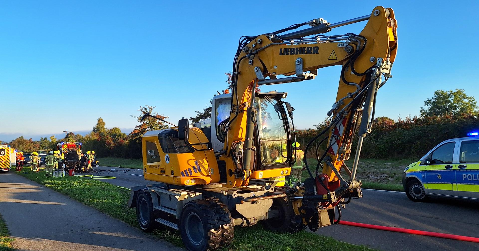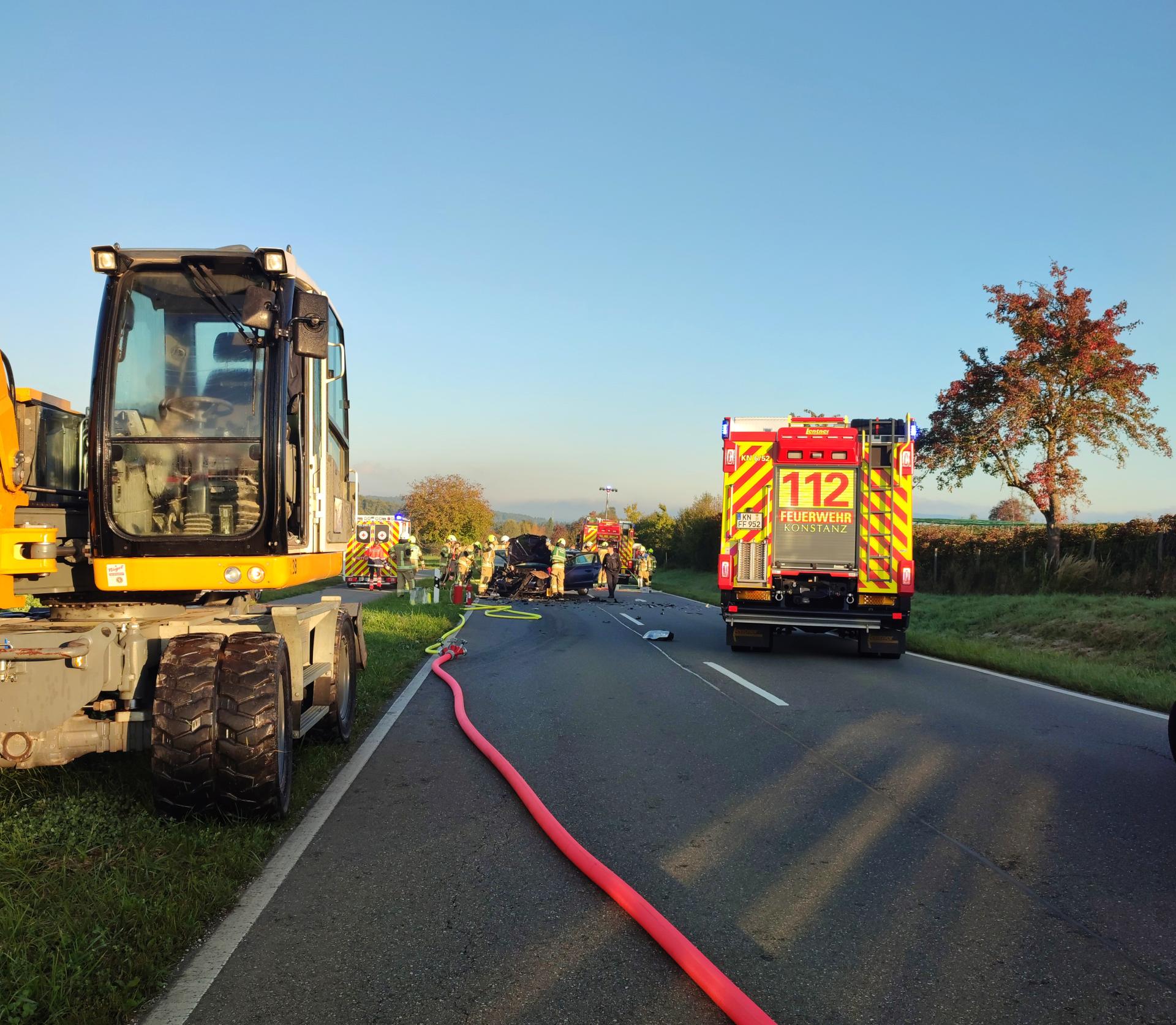 Ein PKW kollidierte mit einem Bagger, wobei zunächst gemeldet wurde, dass eine Person im Fahrzeug eingeklemmt sei. Die Feuerwehr Konstanz wurde daraufhin alarmiert und rückte mit der hauptamtlichen Abteilung, der Abteilung Litzelstetten, der Abteilung Dingelsdorf sowie der Abteilung Dettingen aus.