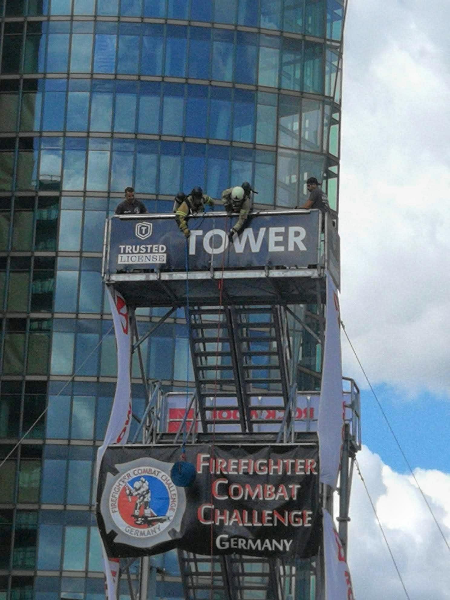Der zu absolvierende Parkour musste auf Zeit möglichst schnell zurückgelegt werden. In kompletter Brandschutzausrüstung mit Atemschutzgerät und Atemschutzmaske galt es, den 12 m hohen Treppenturm mit einem 19 kg schweren Schlauchpaket zu bezwingen. Danach musste auf der oberen Plattform des Turmes ein ebenfalls 19 kg schweres Gewicht nach oben gezogen und in einer vorgesehenen Box abgelegt werden.