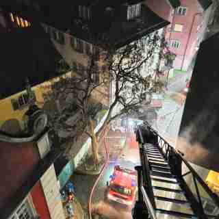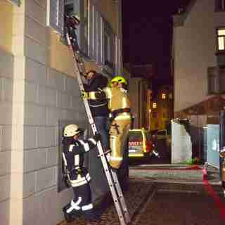 Im Hinterhof musste nach kurzer Zeit ebenfalls eine Steckleiter in Stellung gebracht werden. Weitere eingesetzte Kräfte retteten hier eine Person aus dem ersten Obergeschoss über die Leiter.