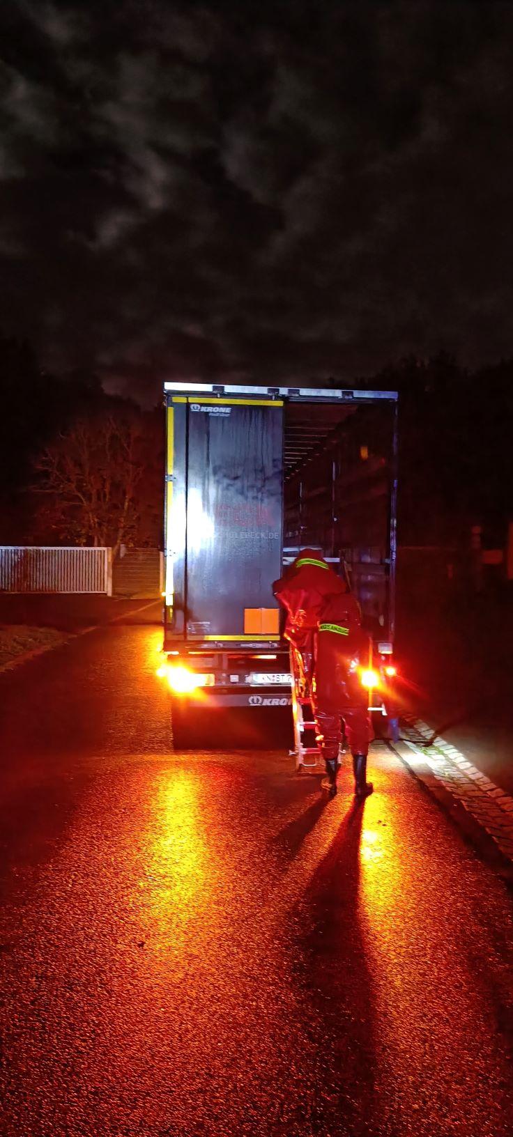 Ein Trupp, welcher unter Atemschutz die Erkundung im Gefahrenbereich fortsetzen, konnte die Lage bestätigen. Aus einem 1000 Liter IBC Container trat ein unbekannter Stoff aus. Ebenfalls konnte der Trupp die Ladepapiere im Fahrzeug ausfindig machen und diese der Einsatzleitung zur Verfügung stellen. Durch den Fachberater Gefahrstoff wurde die Einheitsführung zum Umgang mit dem Stoff beraten.