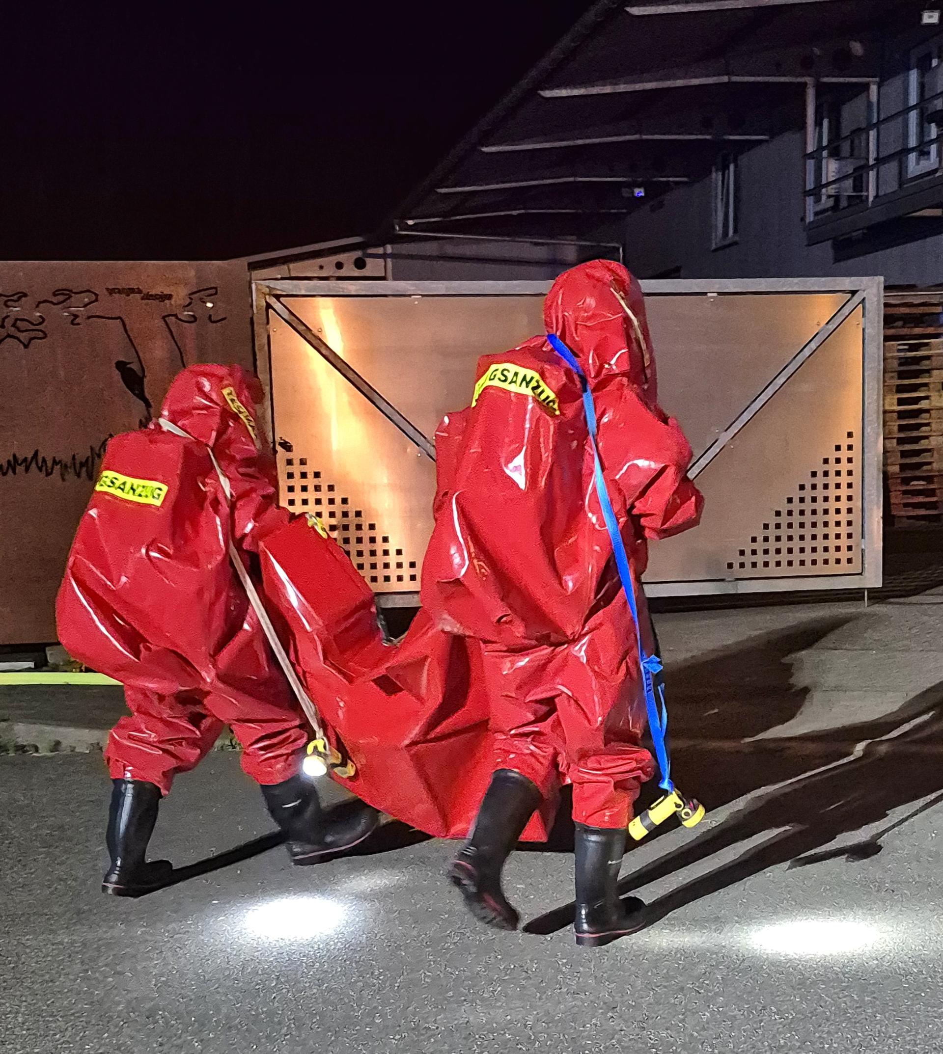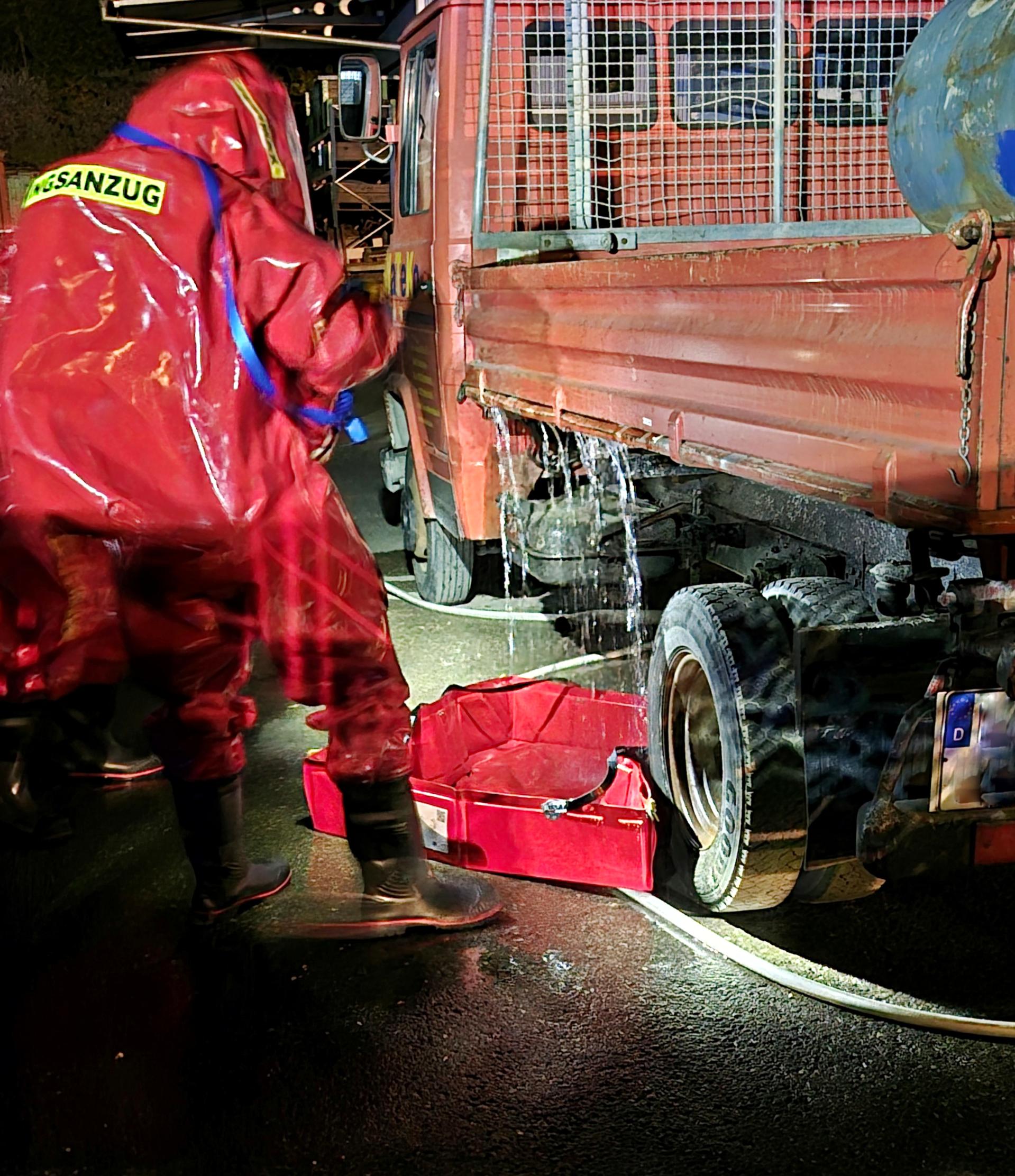 - Modul Bekämpfung: Die Einsatzkräfte führten erweiterte Erkundungsmaßnahmen durch, fingen den austretenden Stoff mit Auffangwannen auf und dichteten die Leckage am beschädigten Behälter ab. Zudem wurden Kanaleinläufe gesichert, um eine weitere Ausbreitung zu verhindern. Alle Tätigkeiten mussten unter Chemikalienschutzanzügen durchgeführt werden. Nach Abschluss der Arbeiten erfolgte die Reinigung und Dekontamination der eingesetzten Trupps.