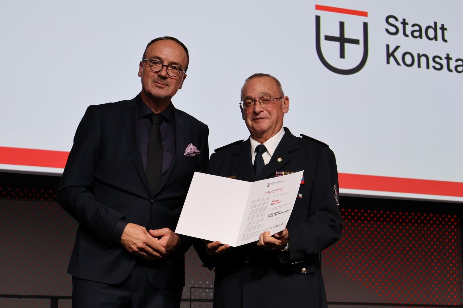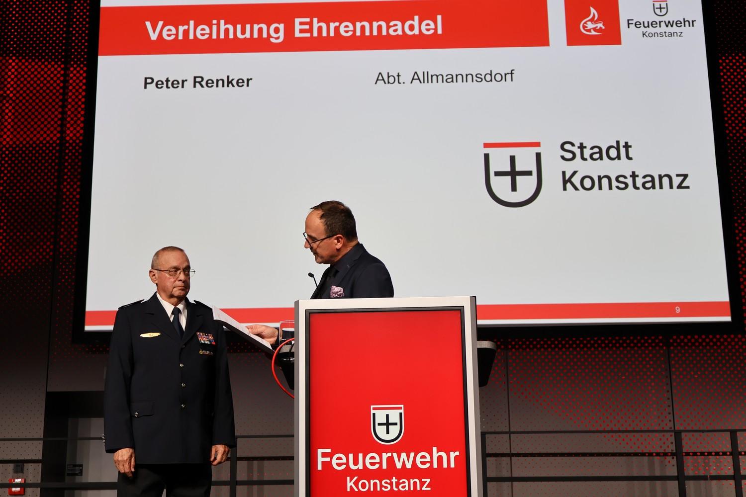 Zum Ende der Rede folgte ein weiterer Höhepunkt des Abends. Oberbürgermeister Uli Burchardt verlieh Peter Renker die Ehrennadel der Stadt Konstanz für sein herausragendes ehrenamtliches Engagement. Peter Renker war über Jahrzehnte in verschiedenen Funktionen im Feuerwehrwesen, bei der Bundeswehr und im Kreisfeuerwehrverband aktiv. Die Gäste applaudierten ihm mit Standing Ovations.