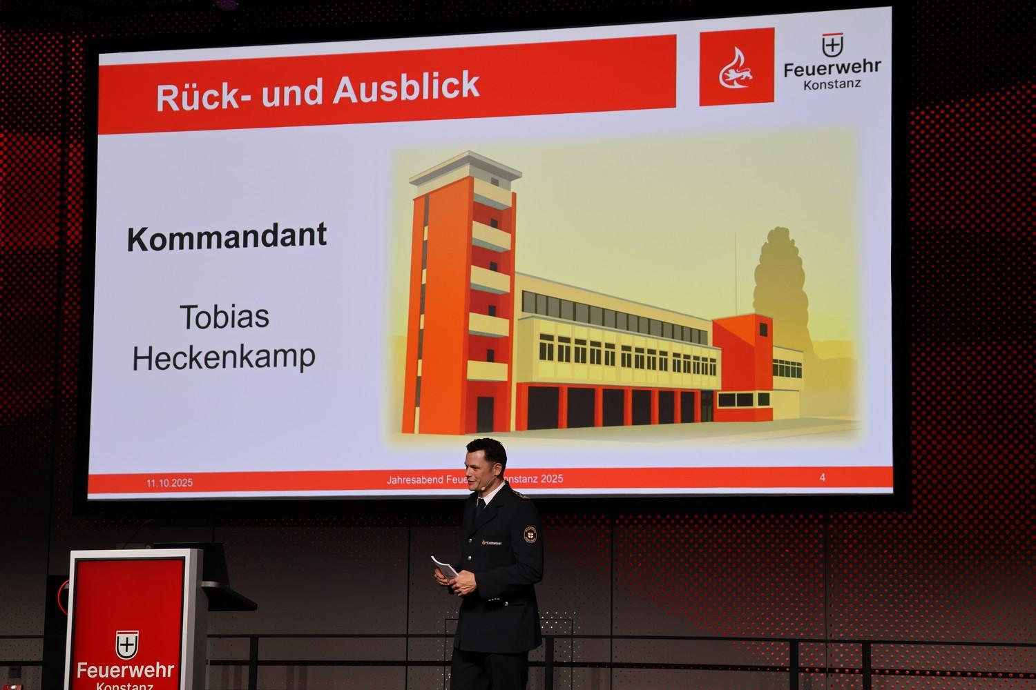 Kommandant Tobias Heckenkamp eröffnete den Abend mit einem Rückblick auf ein einsatzreiches Jahr, welches die Feuerwehr Konstanz immer wieder gefordert hat. Neben zahlreichen Brand- und Hilfeleistungseinsätzen blieben insbesondere einige außergewöhnliche Einsätze in Erinnerung. So musste ein Chamäleon aus einem Baumgerettet werden, und auch einvermeintliches Krokodil nahe des Bodenseessorgte für Aufsehen, stellte sich jedoch als harmlos heraus.