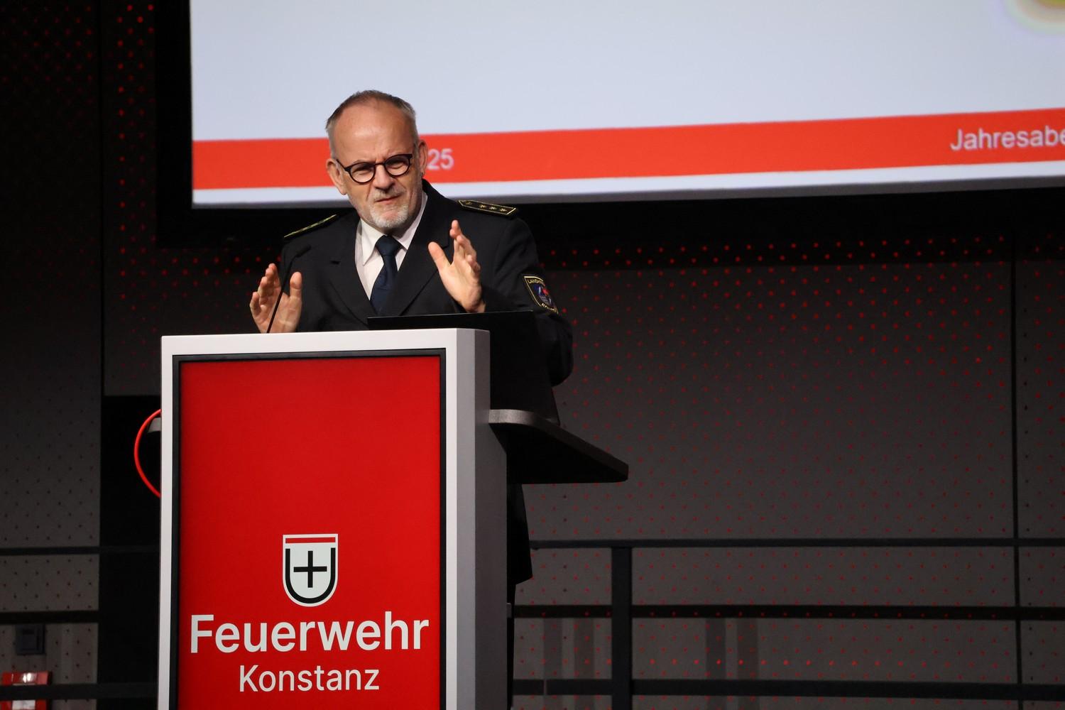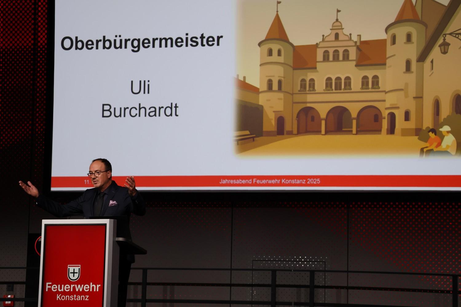 Oberbürgermeister Uli Burchardt würdigte in seinem Grußwort die Arbeit der Feuerwehr als „Vorbild für unsere Gesellschaft“. Er betonte, dass die Feuerwehr Werte wie Zusammenhalt, Hilfsbereitschaft und Verantwortung täglich lebe und damit ein Beispiel für gelebte Gemeinschaft sei. Er sprach den Feuerwehrangehörigen „größten Respekt und Anerkennung“ für ihr unermüdliches Engagement aus und dankte zugleich den Familien und Arbeitgebern, die dieses Ehrenamt durch ihre Unterstützung ermöglichen. Trotz der schwierigen Haushaltslage sichere die Stadt Konstanz zu, auch künftig die notwendigen Mittel bereitzustellen, um die Feuerwehr optimal auszustatten.