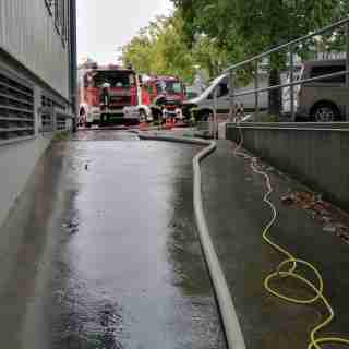 Beim Eintreffen der Einsatzkräfte stand in der ca. 40 x 40 Meter großen Tiefgarage gut 10 cm hoch das Wasser. Auf dem angrenzenden Parkplatz vor der Tiefgarage hatte sich ebenfalls ein größerer See gebildet von welchem aus fortwährend Wasser durch einen Lichtschacht in die Tiefgarage lief.