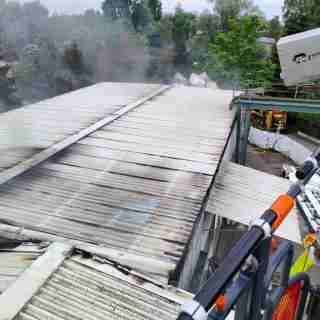 Parallel wurde über die Drehleiter mit dem Wenderohr die angrenzende Halle und deren Brandwand geschützt um ein weiteres übergreifen zu verhindern.