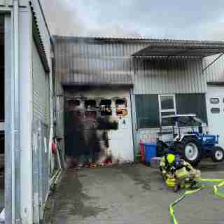 Die in der Halle gelagerten Gasflaschen, Benzintanks und Schweißgeräte wurden von der Feuerwehr gekühlt und sukzessive nach draußen in einen sicheren Bereich gebracht.