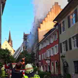 Zur Brandbekämpfung in den engen Gassen wurde zusätzlich eine kleinere Drehleiter der Feuerwehr Konstanz (DLK 12/9) zum Einsatzgeschehen hinzugezogen. Nun erfolgte der Löschangriff auf die nun offenen Dachstuhlbrände über vier Hubrettungsfahrzeuge der Feuerwehr. Ebenso wurde ein massiver Löschangriff mit etlichen Atemschutztrupps im und um die Gebäude vorgenommen.