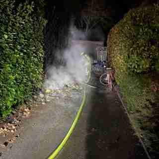Brand eines Müllcontainers im Felchengang. Das Feuer hatte bereits auf eine Hecke übergegriffen und drohte auf eine Gartenhütte ebenfalls überzugreifen.