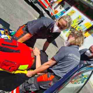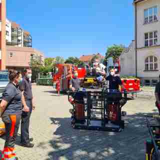Bei der dritten Station wurde die schonende Rettung mit Hilfe der Drehleiter geübt. Dabei konnten die Teilnehmenden auch selber mal den Patienten agieren und sich so in die Lage versetzten, wie es sich anfühlt 30 Meter über dem Boden angeschnallt auf einer Trage zu liegen.