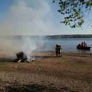 Sämtliches Material wie Schläuche, Atemschutzgeräte und auch Pumpen, welches zur Brandbekämpfung benötigt wird, wurde auf die Boote von DLRG und THW geladen und über den See an die Einsatzstelle verbracht.