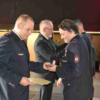 Für 15-jährige Mitgliedschaft wurden mit dem Feuerwehr-Ehrenzeichen in Bronze sieben Kameraden ausgezeichnet. Zwei Kameraden wurden für 25 Jahre mit dem Ehrenzeichen in Silber und sechs Kameraden mit dem Ehrenzeichen in Gold für 40 Jahre ausgezeichnet. Das Ehrenzeichen in Gold in besonderer Ausführung für 50 Jahre aktive Tätigkeit in der Feuerwehr wurde an einen Kameraden verliehen. Danach folgte eine weitere Besonderheit. Die Kameraden, welche im Katastropheneinsatz im Ahrtal sich befanden, wurden durch den Kreisbrandmeister mit einer Fluthilfemedaille ausgezeichnet.