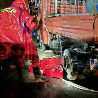 - Modul Bekämpfung: Die Einsatzkräfte führten erweiterte Erkundungsmaßnahmen durch, fingen den austretenden Stoff mit Auffangwannen auf und dichteten die Leckage am beschädigten Behälter ab. Zudem wurden Kanaleinläufe gesichert, um eine weitere Ausbreitung zu verhindern. Alle Tätigkeiten mussten unter Chemikalienschutzanzügen durchgeführt werden. Nach Abschluss der Arbeiten erfolgte die Reinigung und Dekontamination der eingesetzten Trupps.