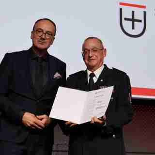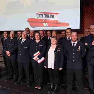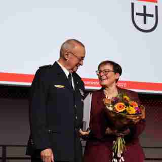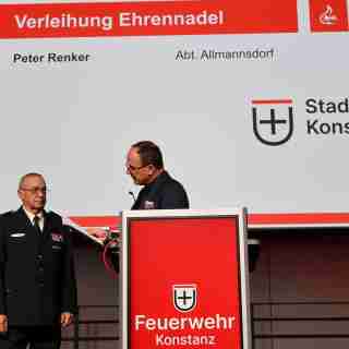 Zum Ende der Rede folgte ein weiterer Höhepunkt des Abends. Oberbürgermeister Uli Burchardt verlieh Peter Renker die Ehrennadel der Stadt Konstanz für sein herausragendes ehrenamtliches Engagement. Peter Renker war über Jahrzehnte in verschiedenen Funktionen im Feuerwehrwesen, bei der Bundeswehr und im Kreisfeuerwehrverband aktiv. Die Gäste applaudierten ihm mit Standing Ovations.