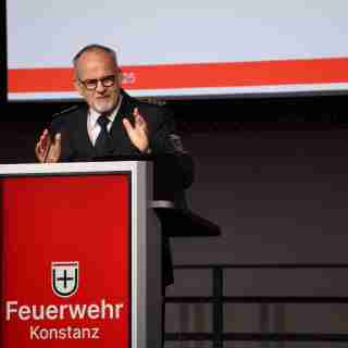 Oberbürgermeister Uli Burchardt würdigte in seinem Grußwort die Arbeit der Feuerwehr als „Vorbild für unsere Gesellschaft“. Er betonte, dass die Feuerwehr Werte wie Zusammenhalt, Hilfsbereitschaft und Verantwortung täglich lebe und damit ein Beispiel für gelebte Gemeinschaft sei. Er sprach den Feuerwehrangehörigen „größten Respekt und Anerkennung“ für ihr unermüdliches Engagement aus und dankte zugleich den Familien und Arbeitgebern, die dieses Ehrenamt durch ihre Unterstützung ermöglichen. Trotz der schwierigen Haushaltslage sichere die Stadt Konstanz zu, auch künftig die notwendigen Mittel bereitzustellen, um die Feuerwehr optimal auszustatten.